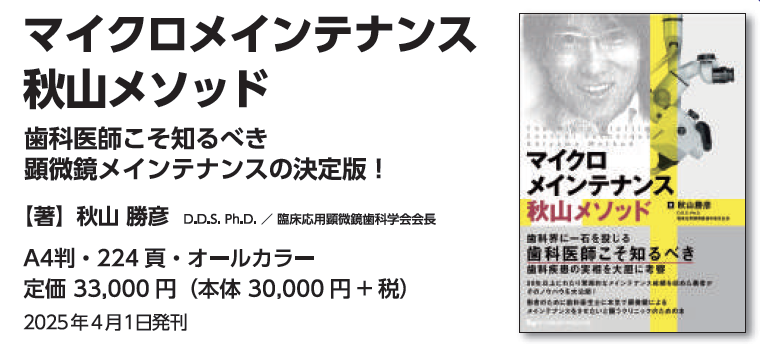 今回は、臨床応用顕微鏡歯科学会の会長であられる秋山勝彦先生が、ご自身のご著書である「マイクロメインテナンス秋山メソッド」のご解説を通して、手術用顕微鏡を用いたメインテナンスについてご教示いただきました。