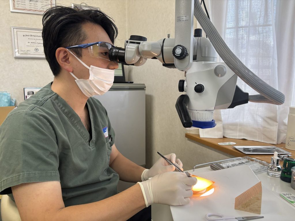実習では、マイクロスコープを用いた治療の際のポジショニング、歯周病治療の最も基本となる歯石除去の方法、マイクロサージェリー(マイクロスコープ下で行われる、特殊な歯周外科処置)の際に使う縫合についてご指導いただきました。しっかり復習し、縫合については、半年後の次の実習までに1000回は行えるよう、精進していきたいと思います。